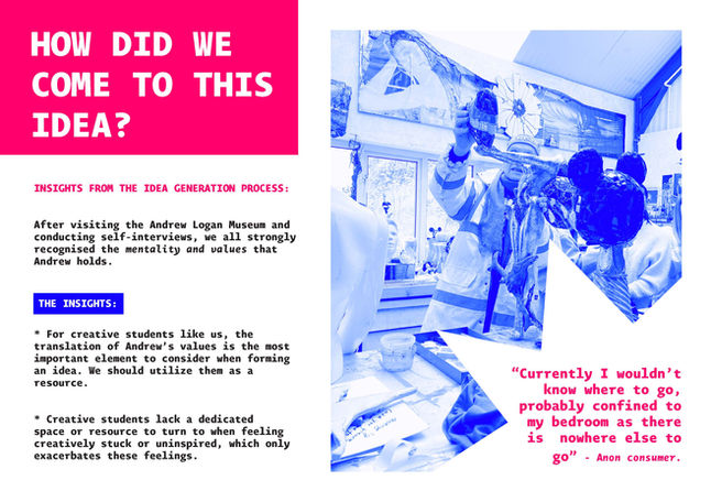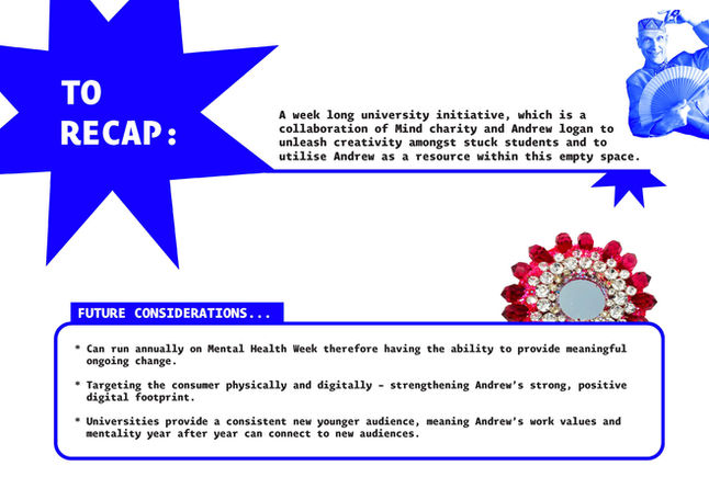 To utilise 'The Andrew Logan Mentality' as a resource for students who are creatively stuck through a university initiative.